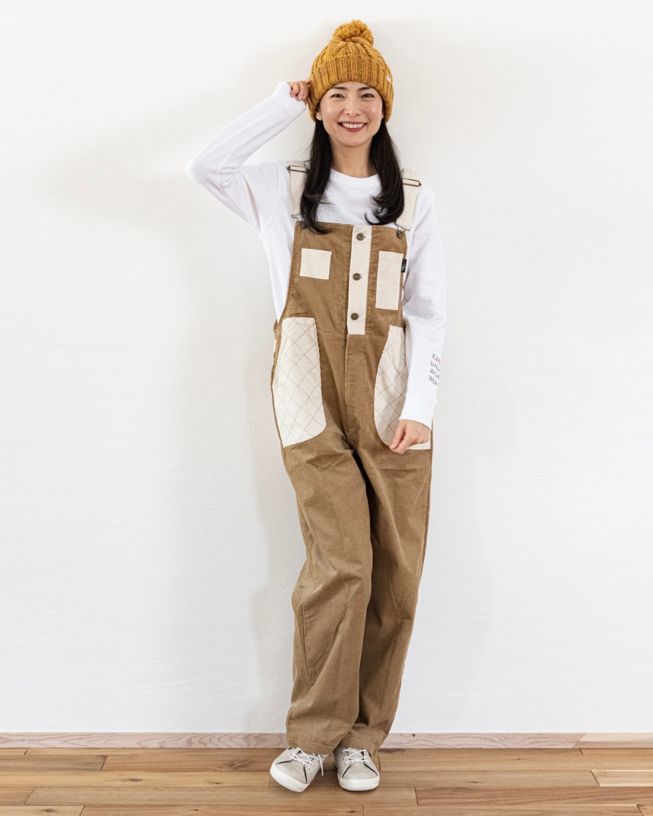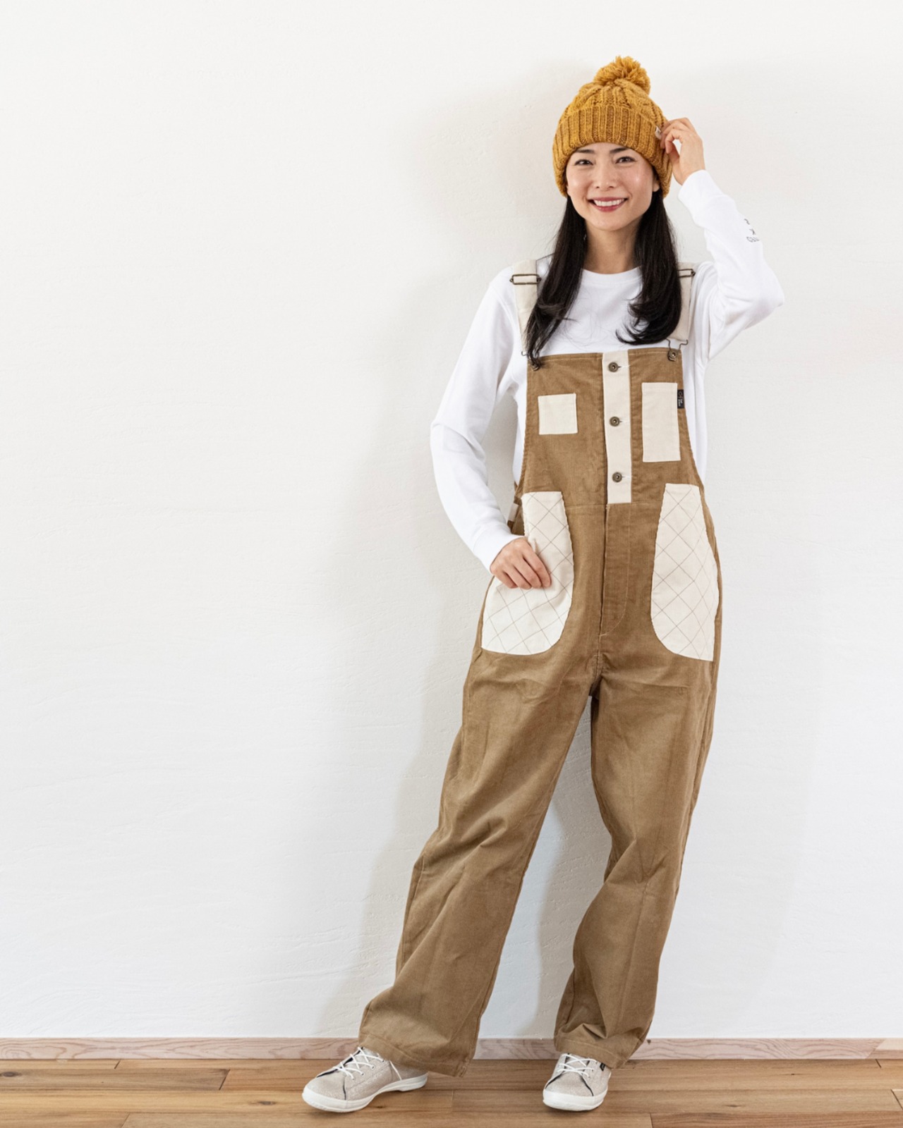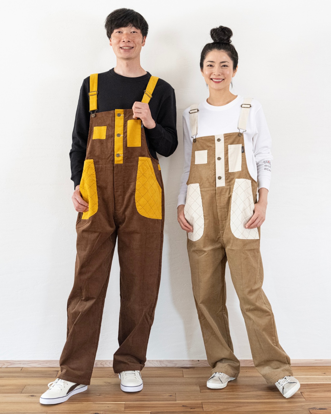 大胆な配色づかいで、かわいいがあふれるコーデュロイサロペットです。