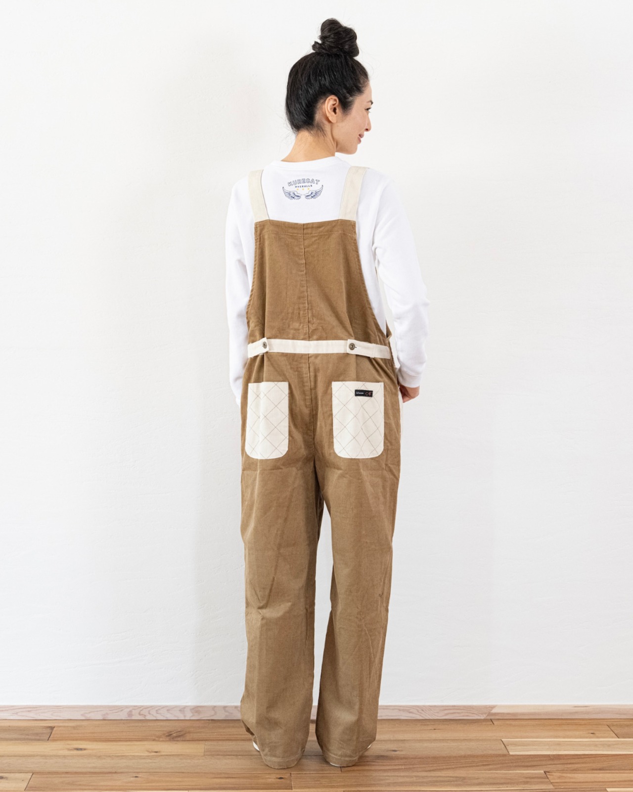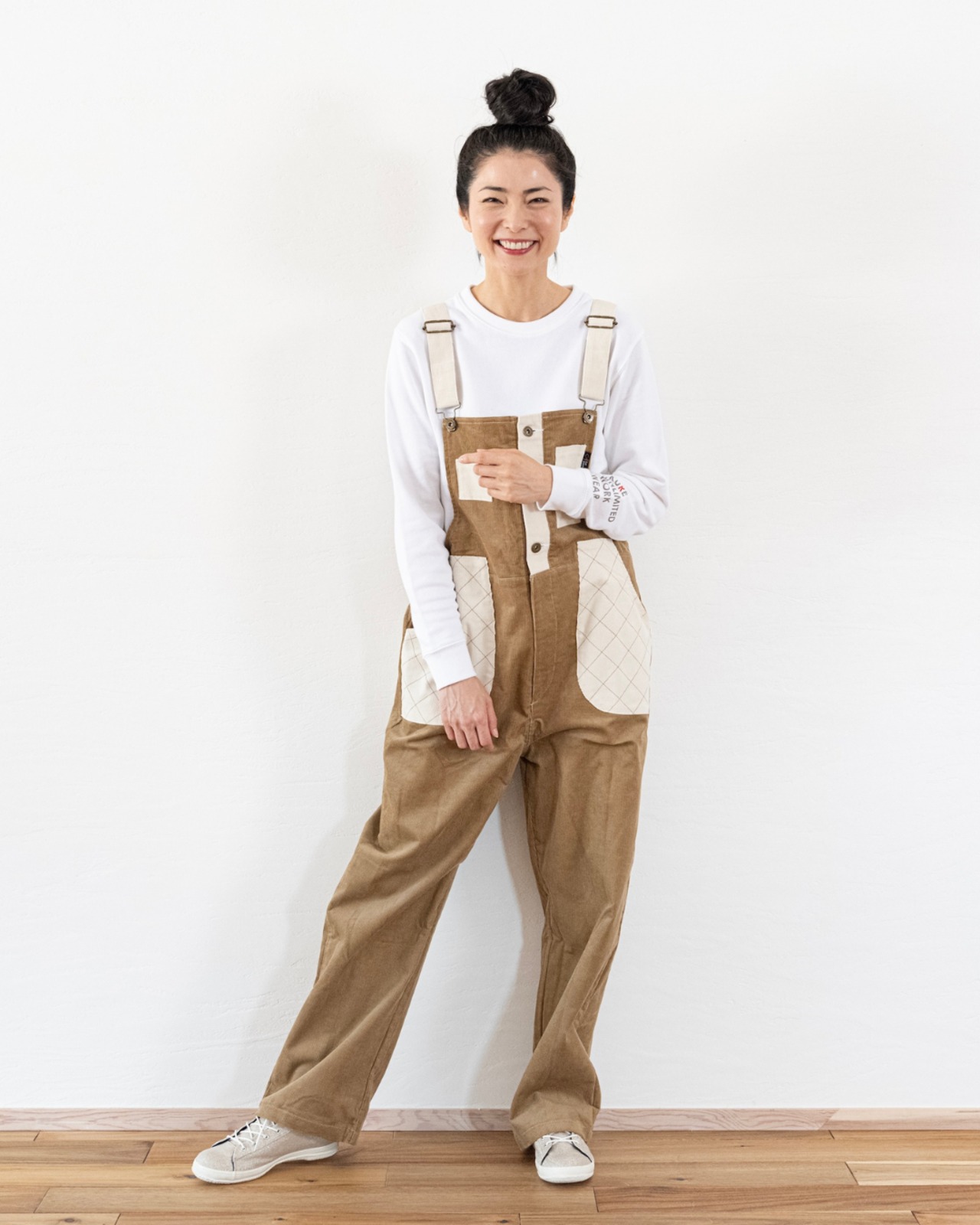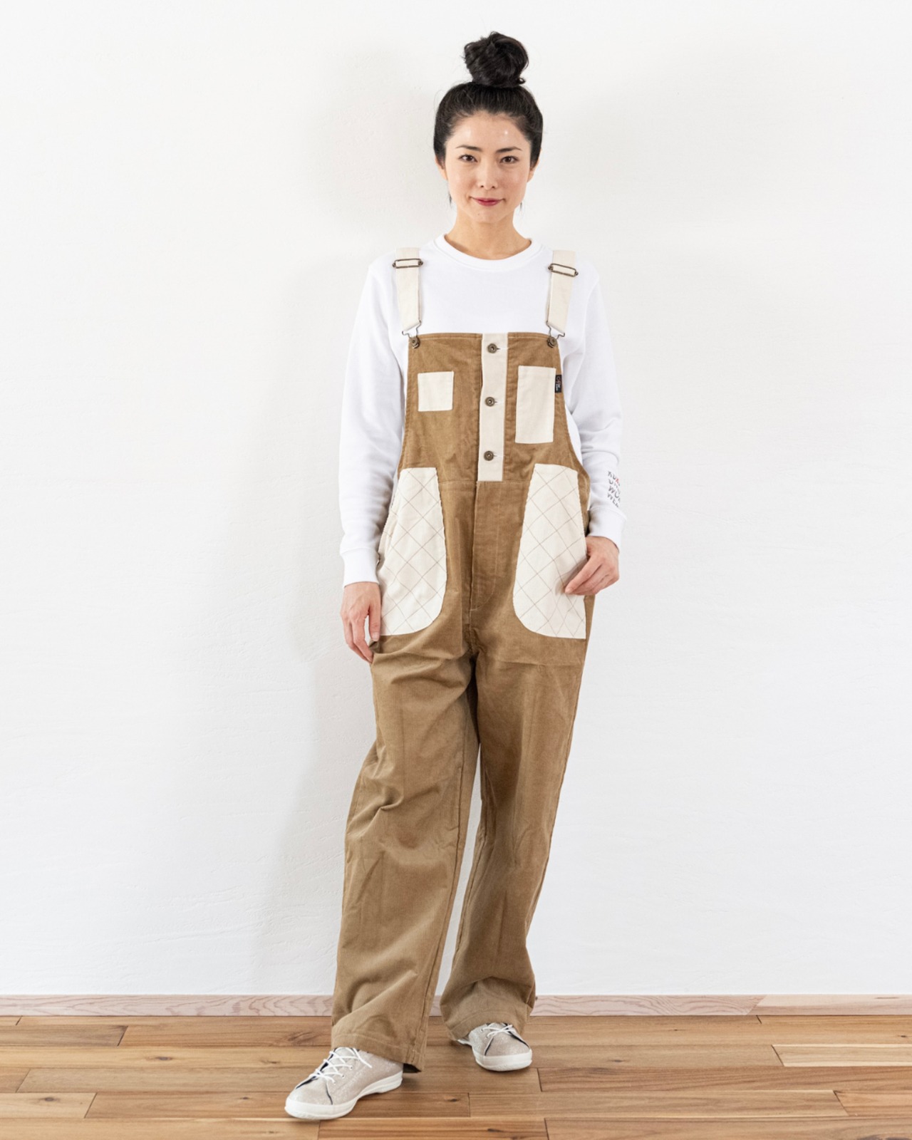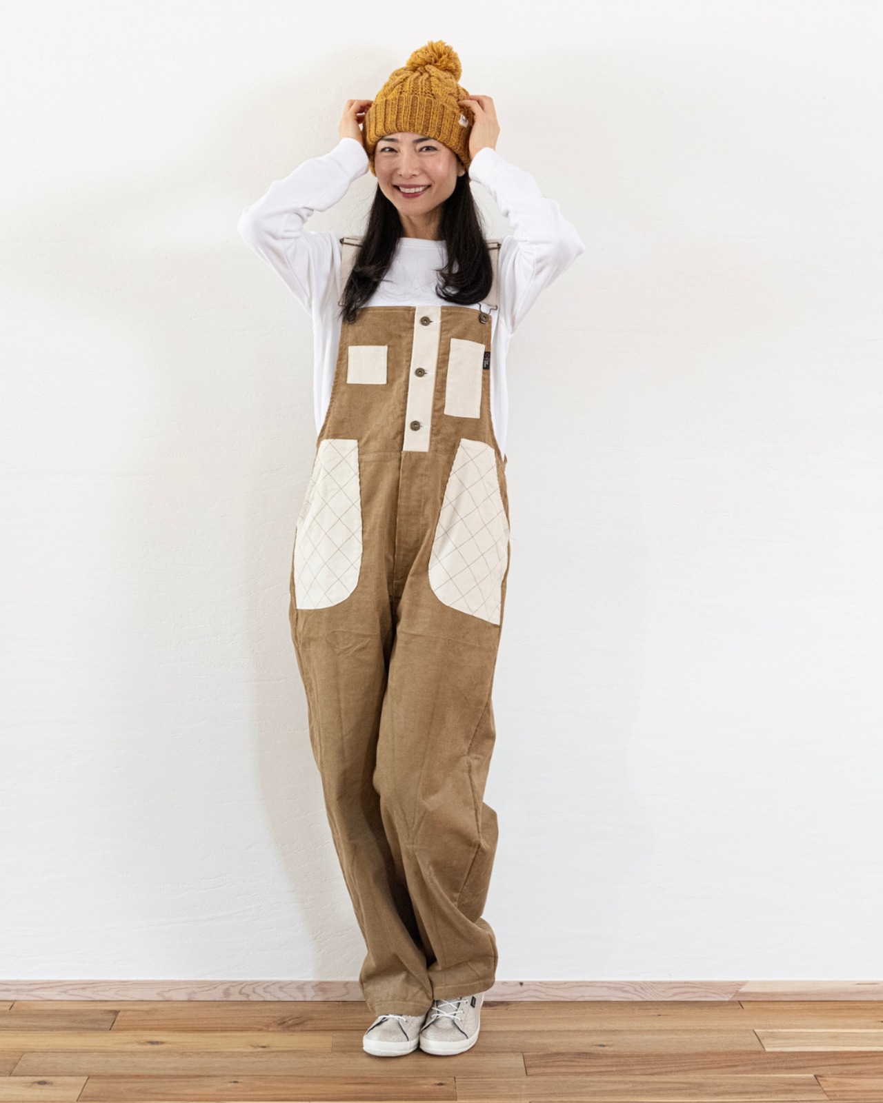 大胆な配色づかいで、かわいいがあふれるコーデュロイサロペットです。