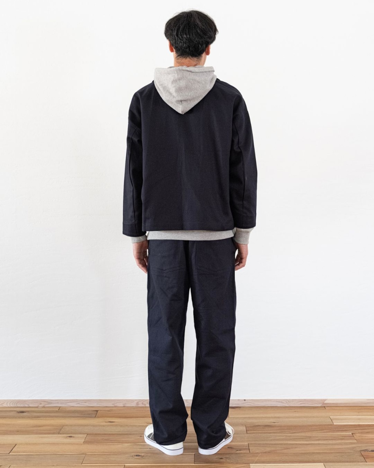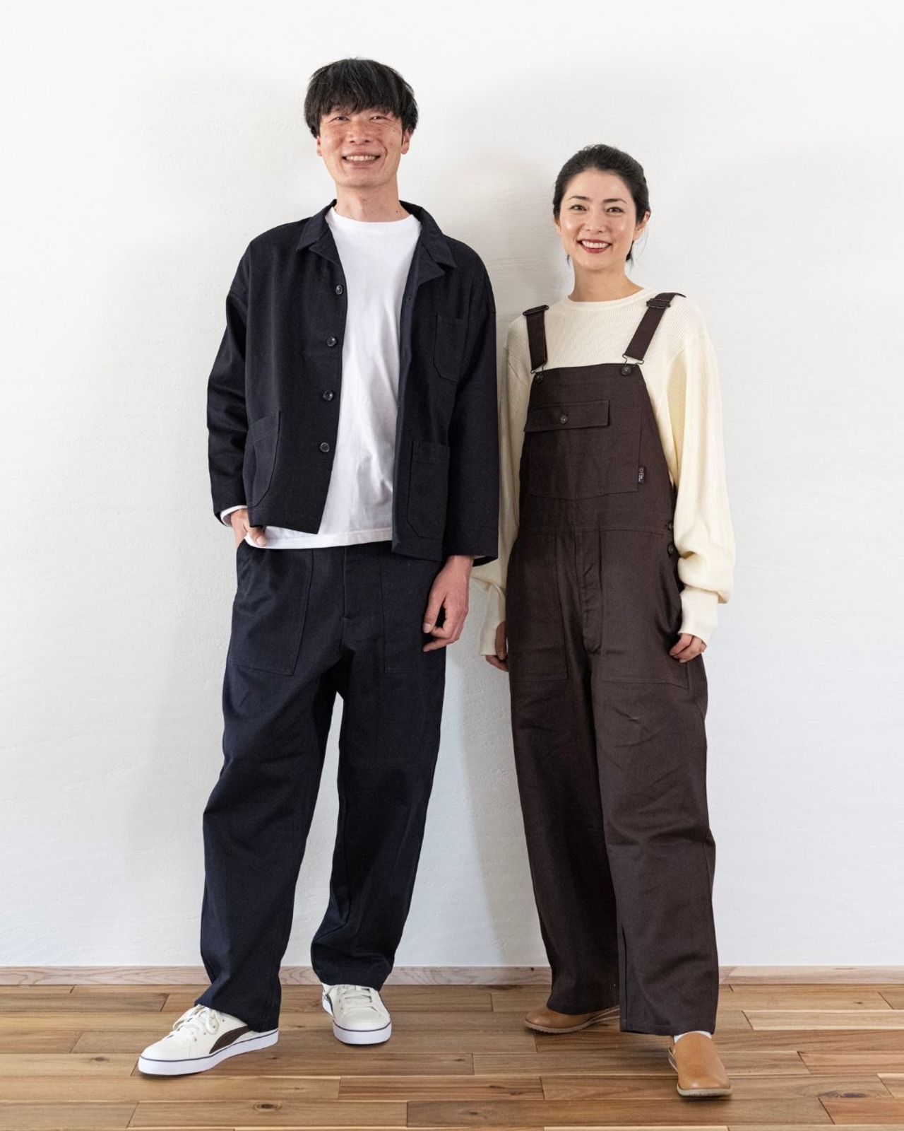 サロペット、ジャケット、パンツのセットアップシリーズでコーディネートは限りない。ワークウェアとしては新しいタイプだけど、筒袖や綿の風合いはどことなくレトロ感が漂う、ビンテージライクでおしゃれなセットアップです。